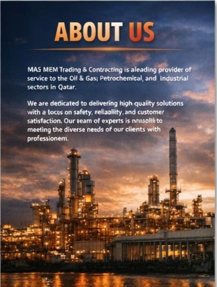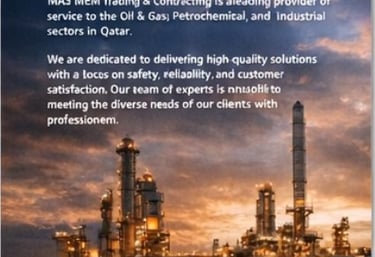 MAS MEM Trading & Contracting is a diversified and reliable company based in Qatar, providing industrial services and material supply to the Oil & Gas, Petrochemical, and Construction sectors. The company is committed to safety, quality, timely delivery, and customer satisfaction.